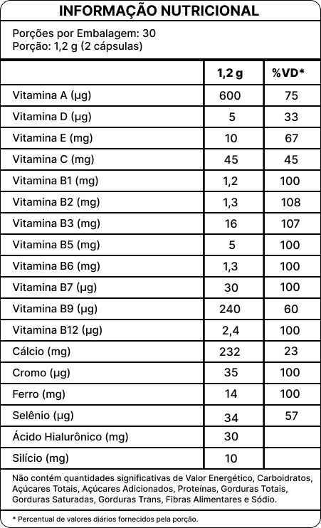 Fórmula especialmente desenvolvida para fortalecer os fios, melhorar a saúde das unhas e proporcionar uma pele mais hidratada, firme e luminosa. Com nutrientes essenciais que atuam de dentro para fora, promove o crescimento saudável do cabelo, aumenta a resistência das unhas e mantém a elasticidade e o viço da pele. Ideal para quem busca realçar a beleza natural com resultados visíveis e duradouros.